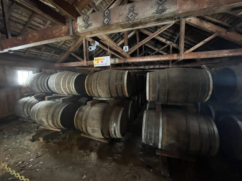見学用に開放された熟成庫内部。手前の樽は空ですが、奥の方の樽は原酒が入って熟成されています。