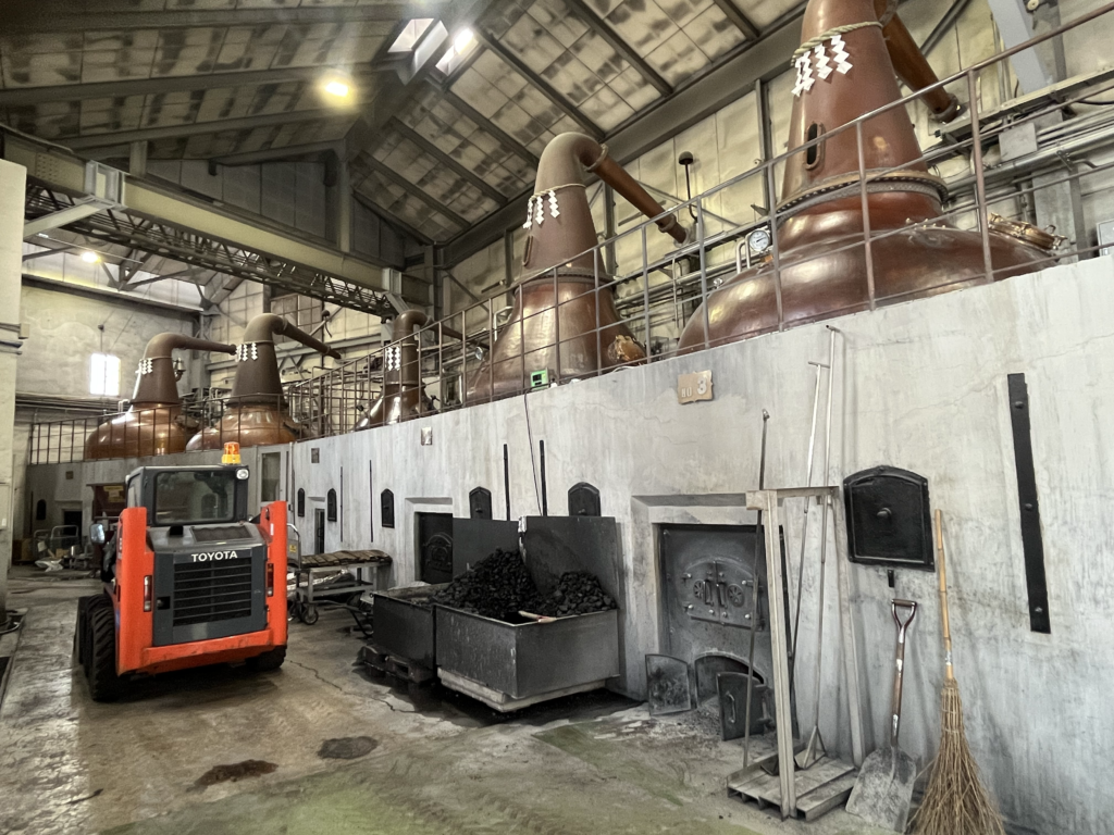 現在もなお続く石炭直火蒸溜。稼働しているスチルは初留4基、再留2基の計6基の構成です。全てストレートヘッド型でアームは下向きに付けられており、余市の重厚な酒質の要因にもなっています。