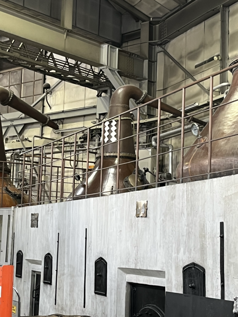 稼働しているのはストレート型ポットスチル6基で、向かって左から3つ目のスチルは創業時のスチルとのことです。このスチルを挟んで左2つが再留釜、右4つが初留釜です。