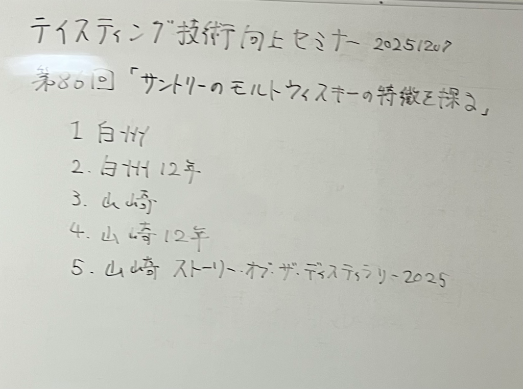 2025年12月7日に開催された「酒育の会 テイスティング技術向上セミナー」に参加してまいりました。今回のテーマは 「サントリーのモルトウイスキーの特徴を探る」。多様な原酒を使い作り込んでいるサントリーのモルトウイスキーの魅力を体感させて頂きました。特に山﨑12年の多層的で膨よかな味わいは印象に残りました。10年以上前に普段飲みしていた頃よりも洗練されていている印象でした。